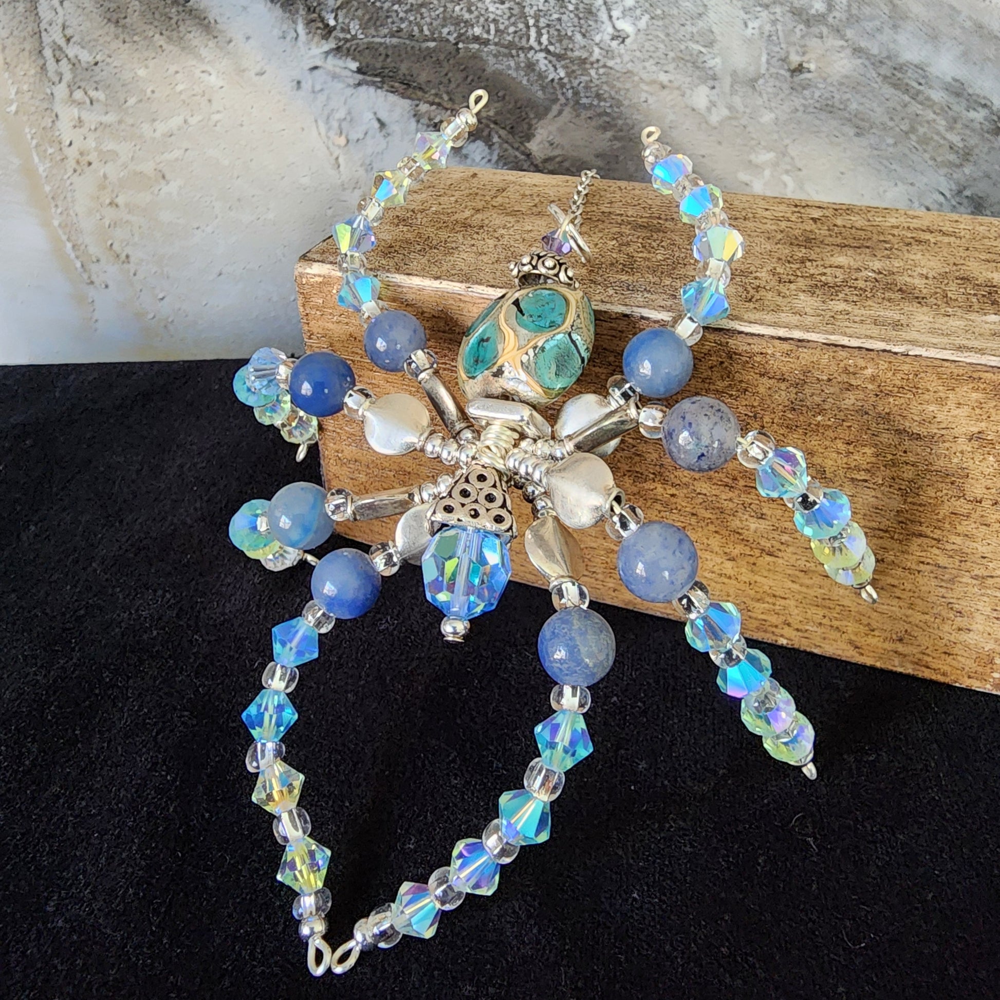 Gleaming in shades of ocean blue and silver, this sparkly little spider shines with blue stones, a decorative beaded body, light blue Swarovski crystals, glass foil accents, and sterling silver beads. Playful, pretty, and full of moonlit charm — she’s ready to dazzle wherever she hangs!
