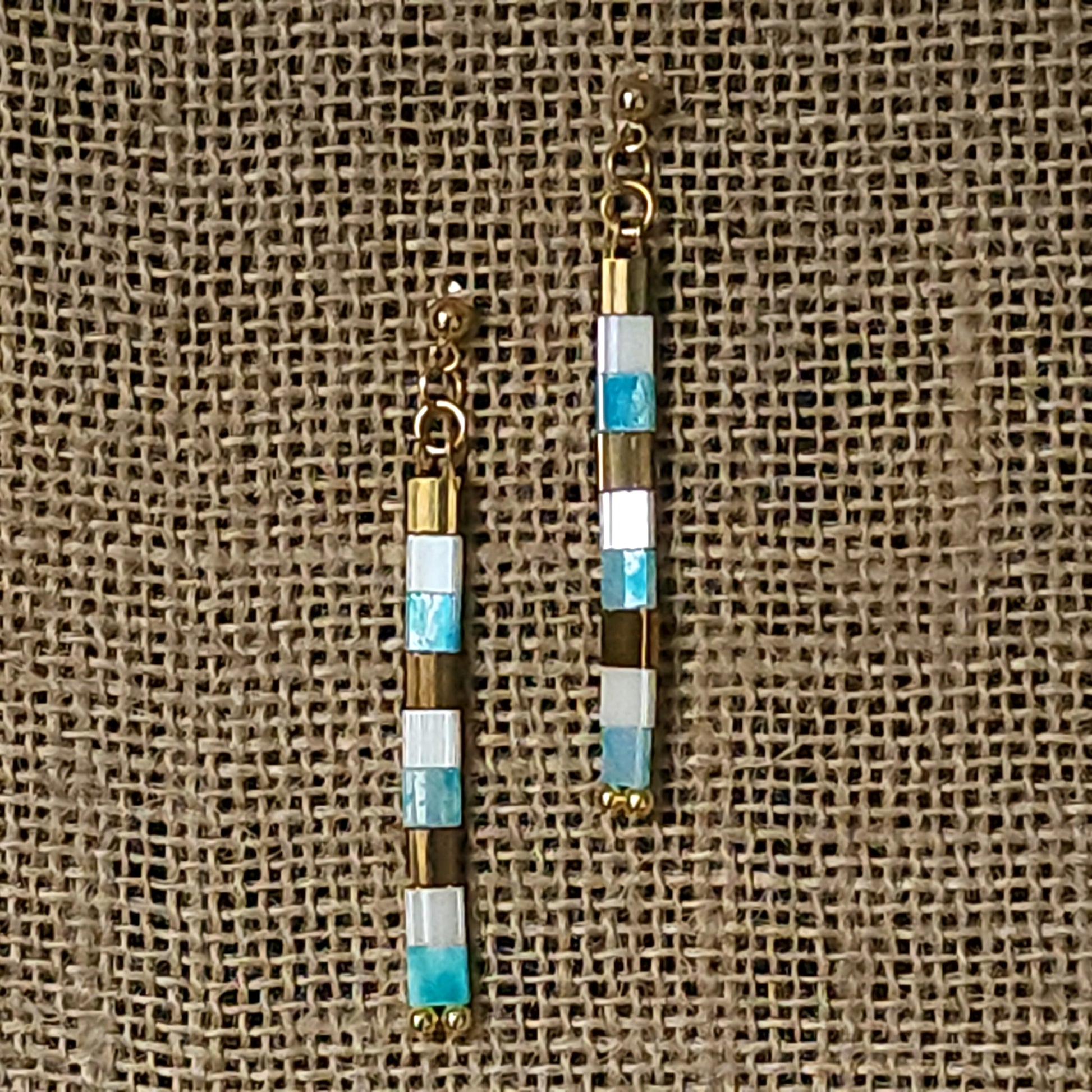 A splash of turquoise, white, and bronze with a hint of gold and set with 18k gold plated stainless steel studs—these 2.25” handmade beauties bring beachy vibes and effortless sparkle to any outfit.