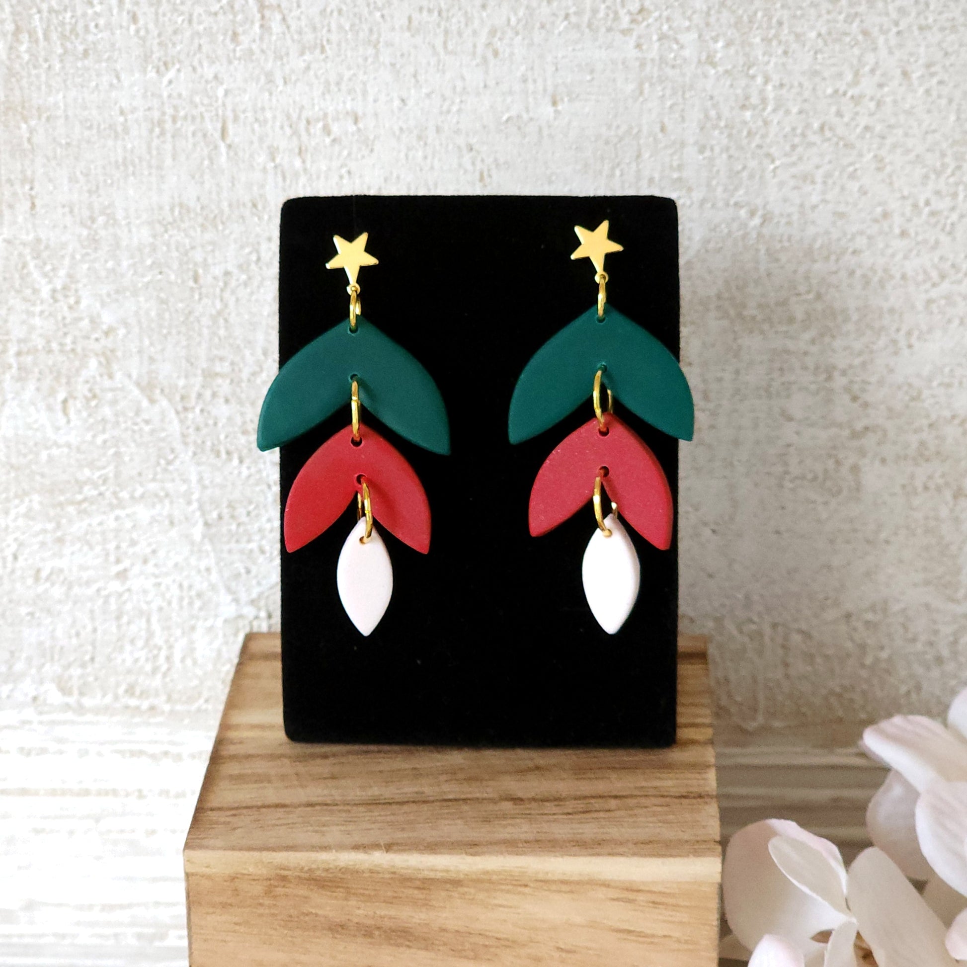 Festive statement earrings featuring gold plated star studs with layered polymer clay leaf shapes in emerald green, red, and white connected with gold jump rings. Bold and playful with a 2¼" drop—perfect for celebrating the holidays with colorful style.