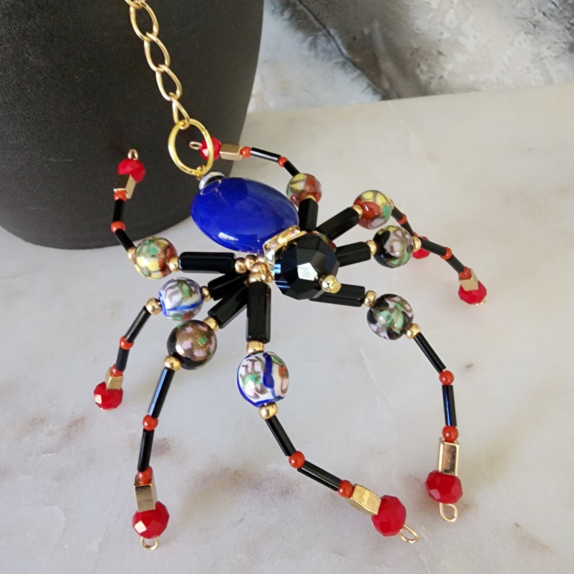 A captivating mix of mystery and bloom, this spider twinkles with a deep blue resin body, gold accents, and delicate floral-patterned beads. It’s a stunning fusion of dark elegance and garden charm — a true statement piece with a whimsical twist.
