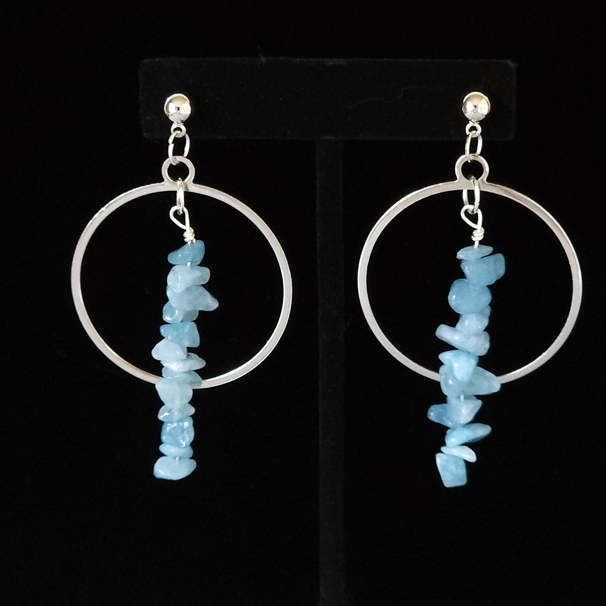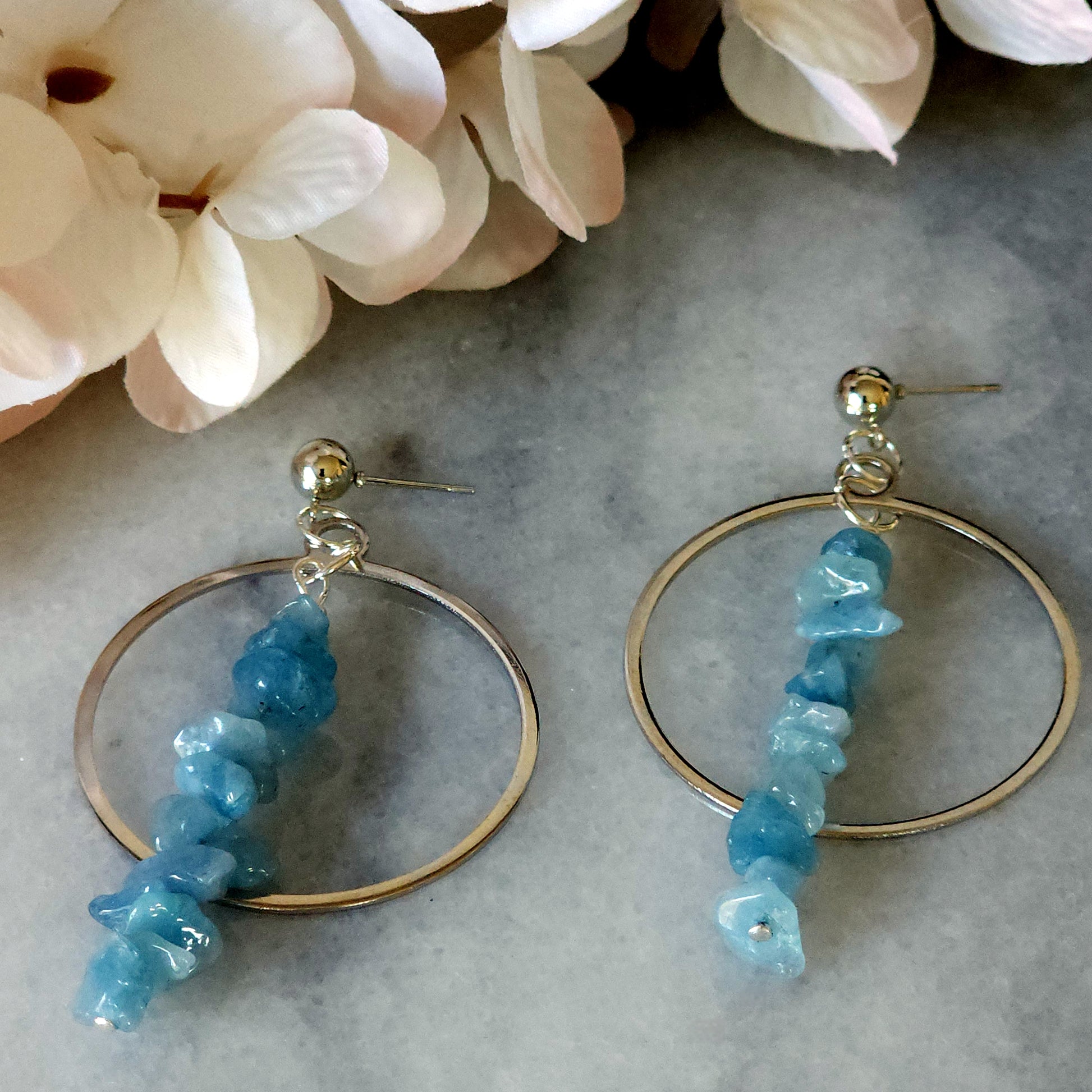 Cool, coastal, and full of charm! These playful hoops feature shimmering aquamarine stones dancing in silver-plated circles, set on silver-plated studs. Perfect for adding a splash of seaside sparkle to your day! 2.5" drop.
