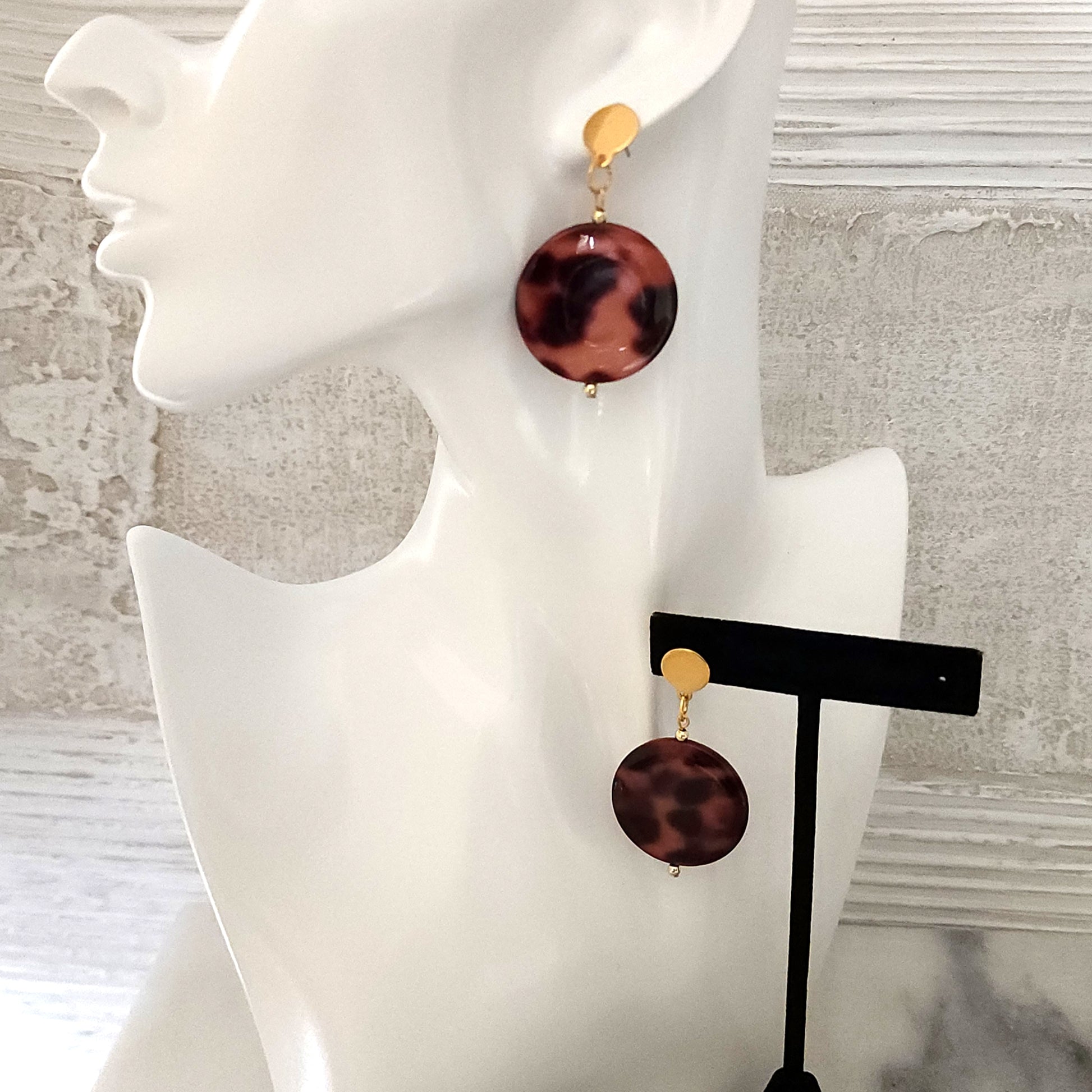 Modern sophistication with round tortoiseshell resin disc beads suspended from polished gold plated stainless steel round studs. A statement piece that's on-trend with a 1¾" drop—perfect for adding contemporary style to any look.